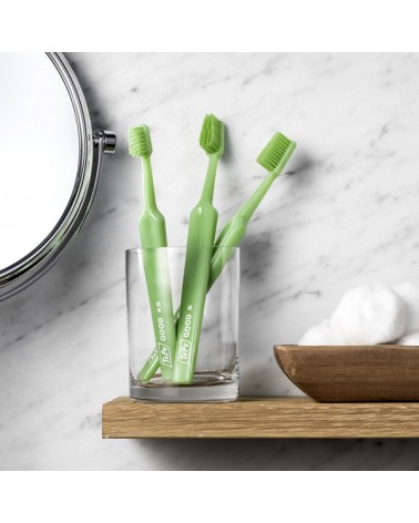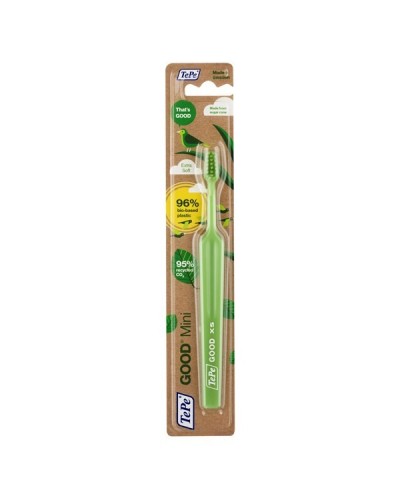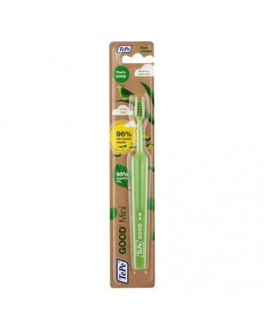 Представляємо зубну щітку TePe GOOD - унікальна зубна щітка з тією ж якістю, дизайном і відчуттями, які ви очікуєте від TePe, але виготовлена на 96% із біо-пластику. TePe GOOD™ Mini Extra Soft - зубна щітка із м'якими ворсинками є частиною унікальної серії TePe GOOD зробленої із пластику на біологічній основі без компромісу якості, ефективносі і дизайну. Зубна щітка TePe GOOD™ Mini Extra Soft рекомендується для використання дітям від 0 до 3-х років. Зручна ергономічна ручка, зроблена із цукрової тростини, і конічна голівка щітки забезпечують кращий доступ у важкодоступні місця ротової порожнини і максимально комфортне чищення. А заокруглені на кінчиках ворсинки із переробленої рицинової олії забезпечують дбайливе чищення зубної емалі не травмуючи її. Шийку зубної щітки можна вигнути під струменем гарячої води, щоб сформувати зручний кут нахилу. Зубна щітка TePe GOOD доступна в зеленому кольорі.